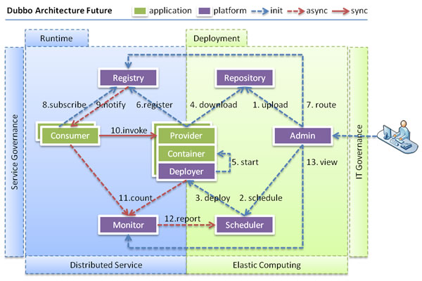 当服务集群规模进一步扩大,带动IT治理结构进一步升级,需要实现动态部署,进行流动计算,现有分布式服务架构不会带来阻力。下图是未来可能的一种架构: